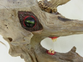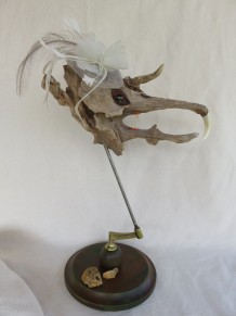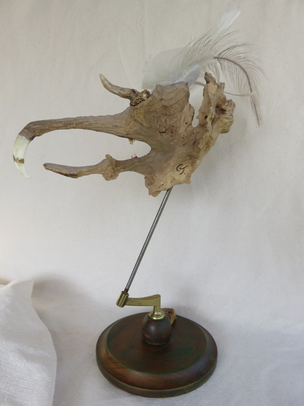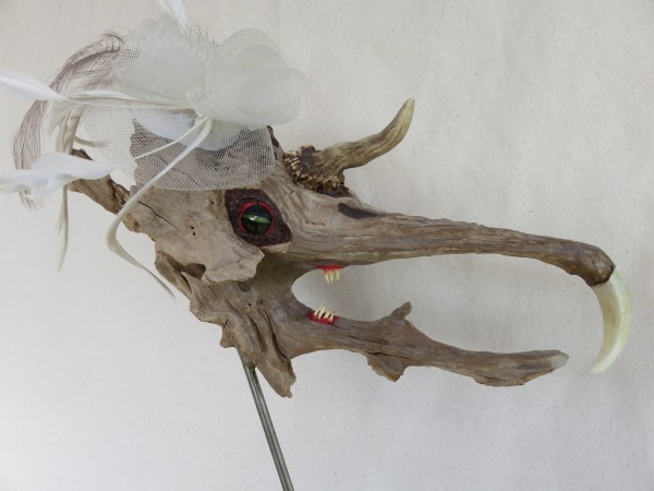 die vergessene Braut Sie wartet schon etwas länger! Der Kopf ist aus einem einzigen Stück Schwemmholz. Es wurde ein Auge (Glas) eingesetzt und die Zähne und das Horn angebracht. Getragen wird der Kopf von einem alten Globusfuss. (Ich habe sie ins Herz geschlossen). h: ca. 45 cm / b: ca. 32 cm