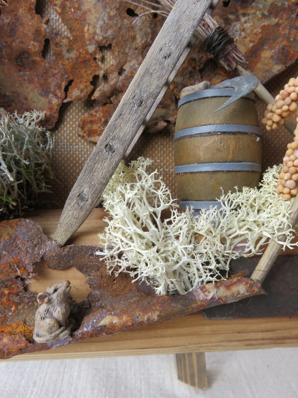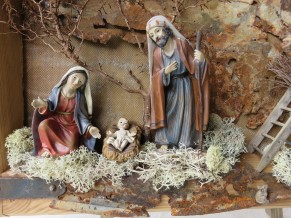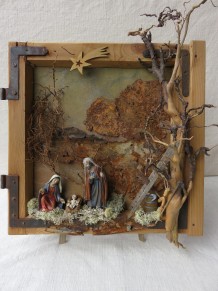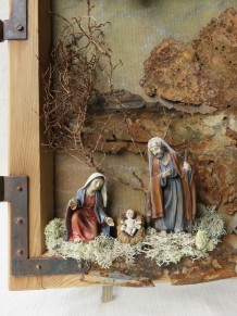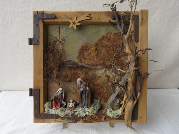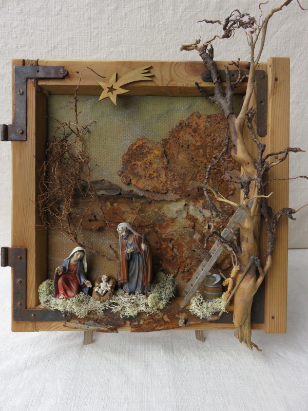 Die Krippe ist in einen kleinen Holzfensterrahmen, mit den originalen Beschlägen, eingearbeitet. Die Figuren sind sehr schön bemalt und aus Kunstharz. Die vielen kleinen Details sieht man meist erst auf den zweiten Blick. Hinter dem Holzstern ist eine LED-Leuchte installiert. Die Krippe kann aufgehängt werden (Aufhänger sind angebracht). Sie kann mit Hilfe der kleinen Staffelei auch aufgestellt werden (Staffelei im Preis enthalten). In eine Weihnachtskrippe muss man sich verlieben, nur so erfreut sie einen über viele Jahre immer wieder aufs Neue.